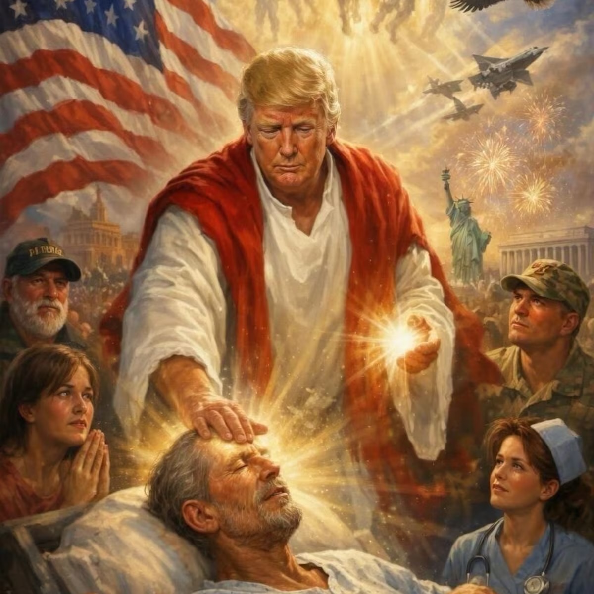 A imagem, publicada na conta do presidente em sua plataforma de mídia social, Truth Social, mostra Trump vestido com vestes brancas e vermelhas. Na ilustração, as mãos do presidente emitem luzes brilhantes, e sua mão direita toca a testa de um homem deitado em uma cama, vestindo uma bata hospitalar.