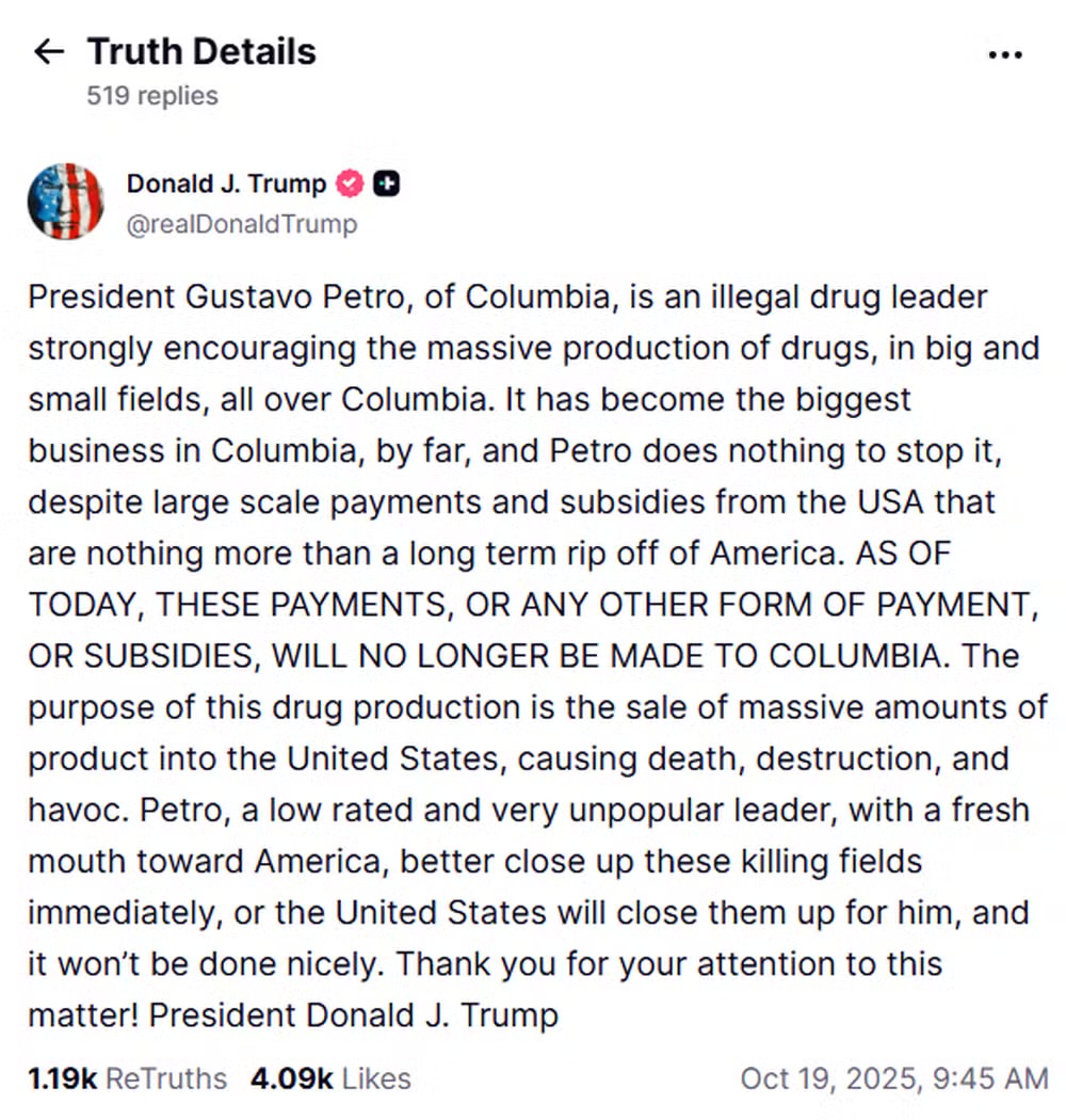 No domingo (19), Trump retirou uma ajuda financeira de seu país à Colômbia sob o argumento de que o governo colombiano está fomentando a produção de drogas. Em uma publicação, o norte-americano chamou Petro de “traficante de drogas”.