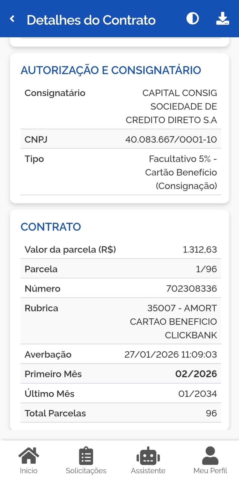 Segundo Lucena, no dia 27 de janeiro de 2026, às 11h09, foi registrada no sistema a contratação não autorizada de um empréstimo dividido em 96 parcelas de R$ 1.312,64 cada, com início de desconto previsto já para fevereiro.