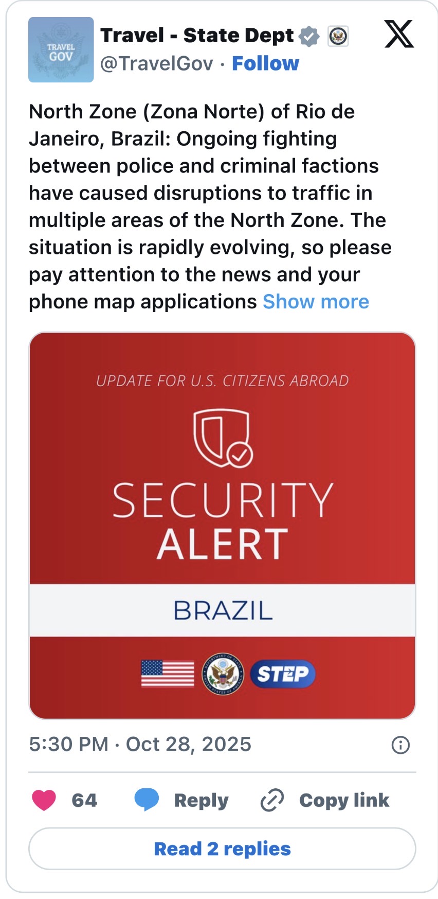 O Departamento de Estado dos Estados Unidos emitiu um alerta de segurança para viajantes após a megaoperação policial contra o Comando Vermelho, no Rio de Janeiro, nesta terça-feira (28). O aviso é voltado a cidadãos americanos que já estão na cidade.
