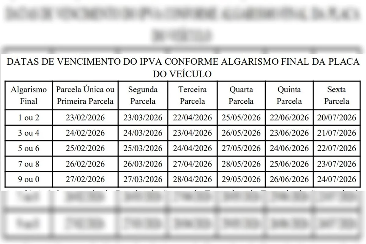 As datas de vencimento para o pagamento da 1ª parcela ou cota única das placas 1 e 2, 3 e 4, 5 e 6, 7 e 8, 9 e 0, serão, respectivamente, nos dias 23, 24, 25, 26 e 27 de fevereiro de 2026.