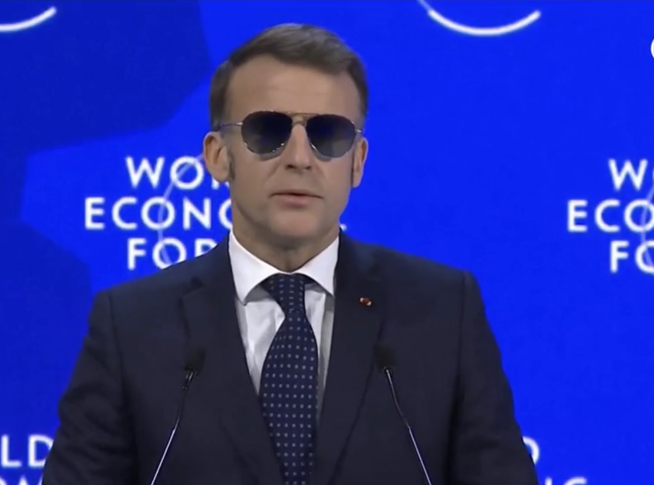 O uso de óculos escuros pelo presidente francês para discursar também chamou a atenção da plateia em Davos e nas redes sociais. Na semana passada, Macron disse que tem utilizado o acessório por conta de “uma condição ocular completamente inofensiva“.