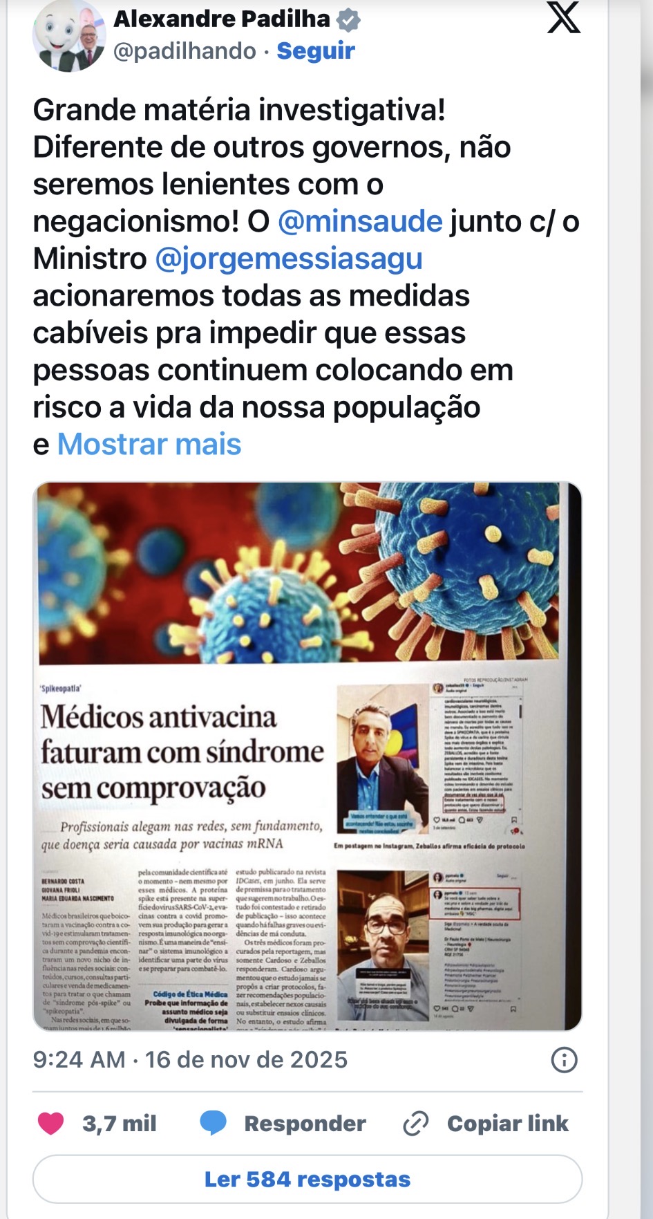 Pela manhã, o ministro Alexandre Padilha já havia ido às redes sociais anunciar que, em conjunto com a Advocacia-Geral da União (AGU), adotaria “medidas cabíveis” contra a difusão do que esses médicos chamam de “síndrome pós-spike” ou “spikeopatia”, em relação a vacina de RNA mensageiro (mRNA), usada durante a pandemia de Covid-19.