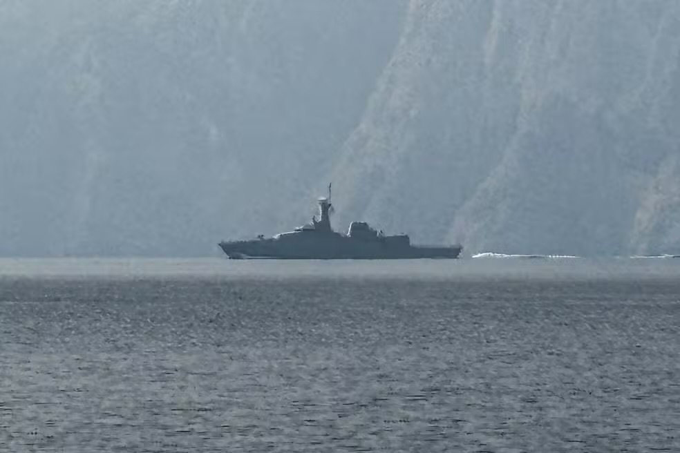 Um navio da marinha é visto navegando no Estreito de Ormuz, por onde passa grande parte do petróleo e gás do mundo, em 1º de março de 2026. — Foto: SAHAR AL ATTAR / AFP