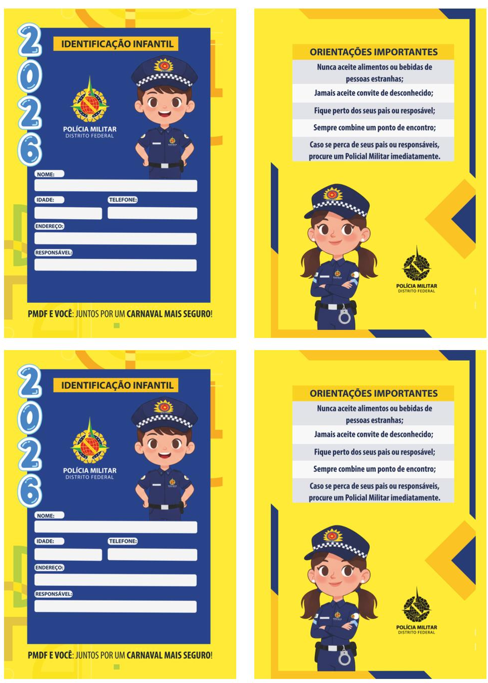 Os responsáveis são orientados a registrar as crianças por meio da Carteirinha de Identificação Infantil, que pode ser impressa no site da PMDF e anexada à roupa ou usada como crachá. O documento inclui o nome da criança e o telefone de contato dos responsáveis.