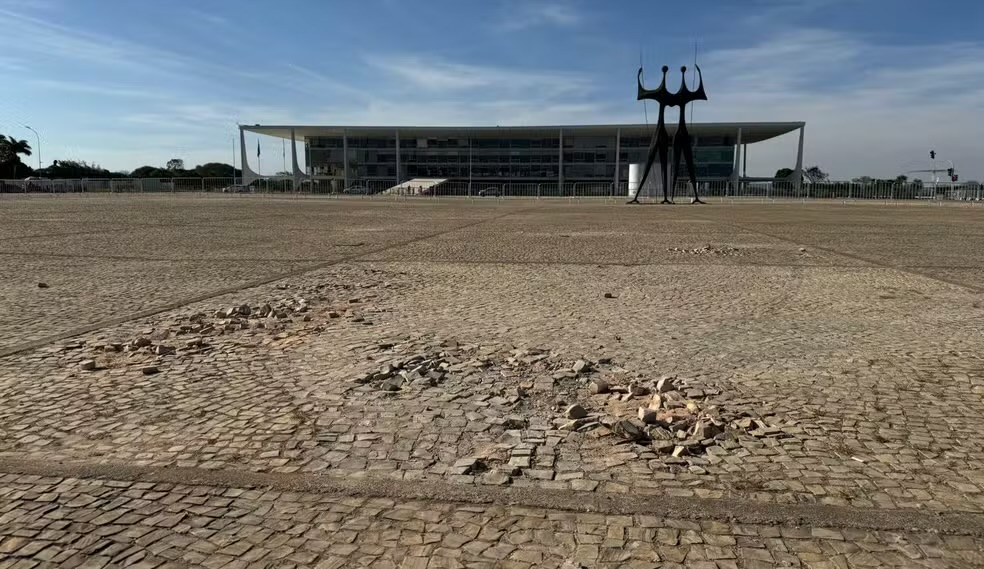 Pedras portuguesas soltas na Praça dos Três Poderes. — Foto: Fernanda Bastos/g1
