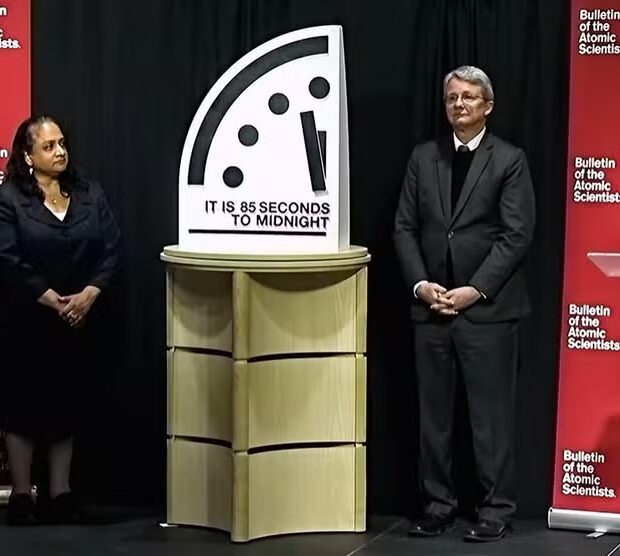 Os membros do Boletim dos Cientistas Atômicos fizeram uma demonstração inicial na sexta-feira, 23, e anunciaram os seus resultados na terça-feira. Os cientistas citaram os riscos de uma guerra nuclear, as alterações climáticas, o potencial uso indevido da biotecnologia e o uso crescente da inteligência artificial sem controles adequados, ao fazerem o anúncio anual, que avalia o quão perto a humanidade está do fim.