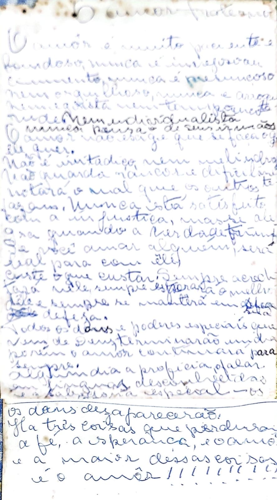 Algum dia a profecia, o falar em línguas desconhecidas  e a sabedoria especial – os dons – desaparecerão. Há três coisas que perdurarão: a fé, a esperança e o amor, e a maior dessas coisas é o amor!!!!!!!!
