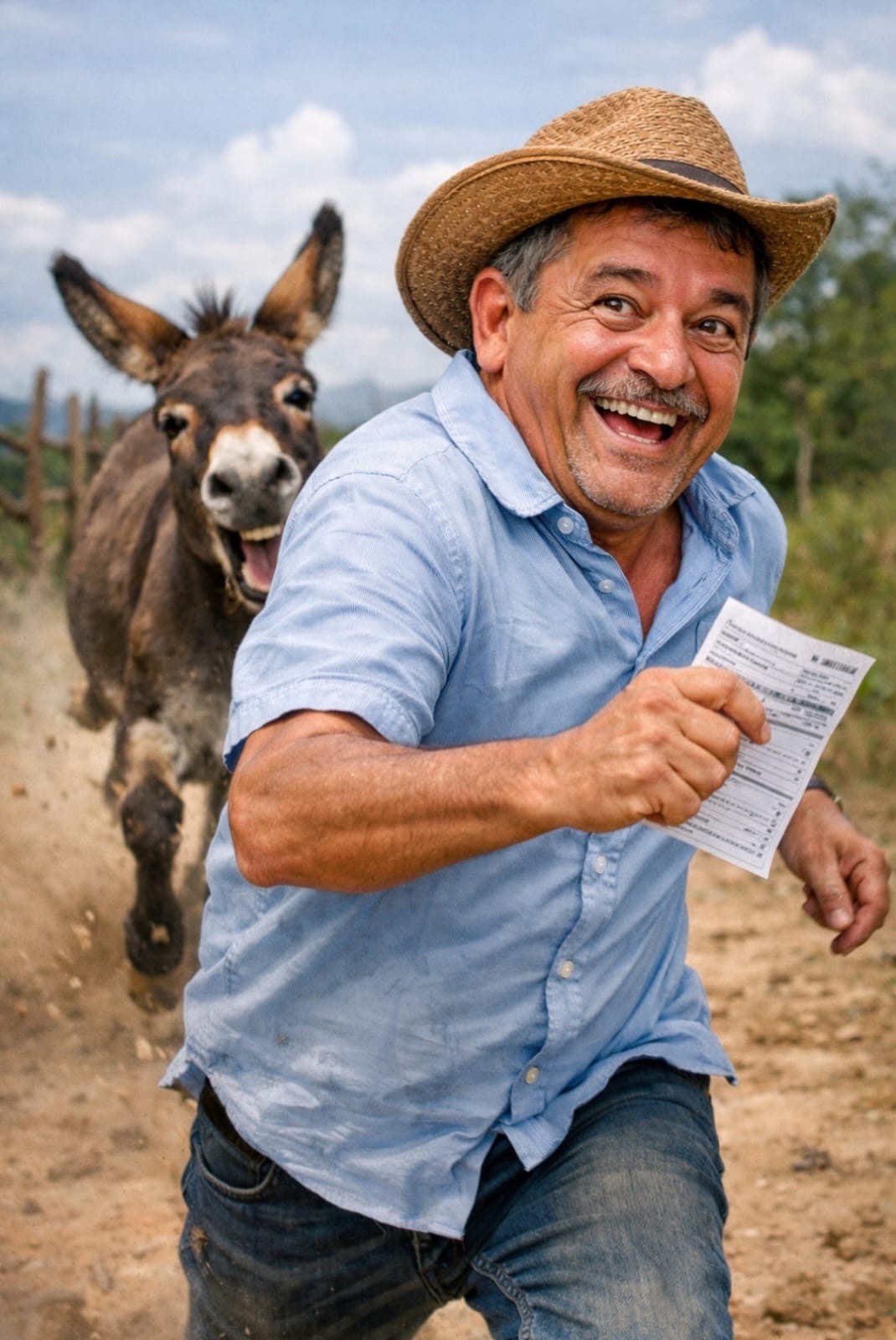 Mas, no fim do sonho — e é sempre no fim que a verdade aparece —, surgiu um jumento desmarcado correndo atrás de mim. Acordei na carreira, suando, igual pobre quando chega mensagem do banco dizendo: “aviso importante sobre sua conta”.
