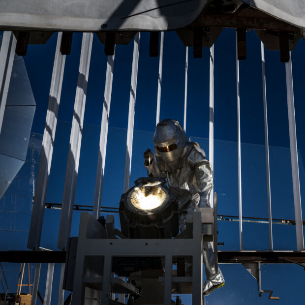 Panatere metallurgical engineer Jean-Francois Dionne wearing a thermal protective suit puts an aluminum bar into the crucible during a presentation of a solar furnace designed to melt steel from production waste and recirculate it into industry, in La Chaux-de-Fonds, western Switzerland, on October 2, 2025. (Photo by Fabrice COFFRINI / AFP)