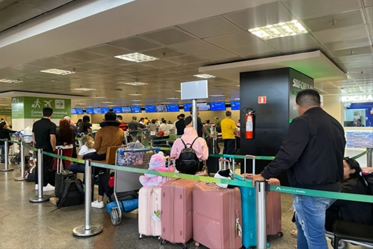 Em nota, a Latam informou que os passageiros afetados pelos cancelamentos e atrasos podem permanecer na fila ou reservar seu hotel e transporte por meios próprios.